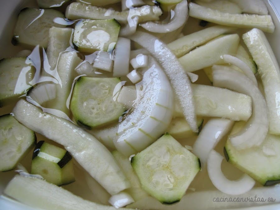 Poner el calabacín y la cebolla en un recipiente, añadir un poquito de sal (opcional) y cubrir con vinagre. Dejar en el frigorífico hasta el momento de servir.