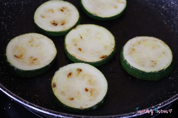 Lavamos bien el calabacín y lo cortamos en rodajas de medio centímetro aproximadamente y salpimentamos.