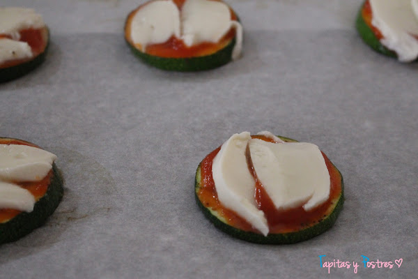 Ponemos las rodajas de calabacín en una bandeja de horno con papel vegetal. Les ponemos un poco de tomate frito encima.
