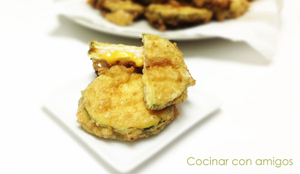 Montamos rodaja de calabacín, sobre esta el queso y el jamón y cerramos con el calabacín, pasamos por harina y luego por el huevo batido y freímos en una sartén con abundante aceite caliente.
