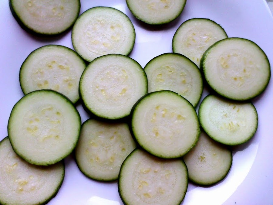Lavamos y troceamos el calabacín en rodajas finas y lo extendemos en una bandeja. Añadimos sal y esperamos a que pierda líquido. La sal hará que suelte agua, y mientras tanto podemos ir preparando el relleno.