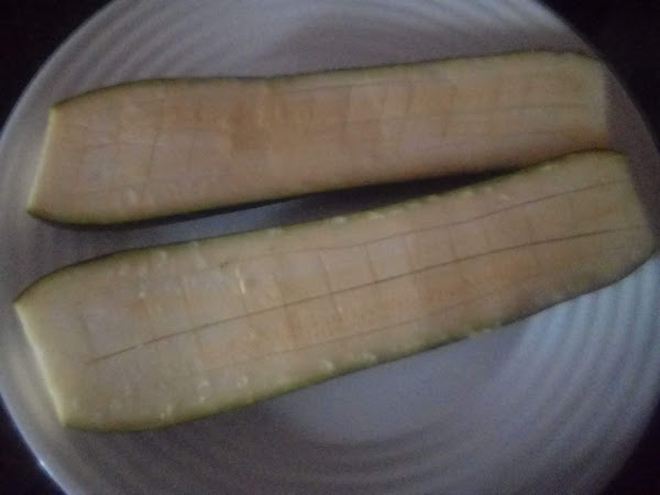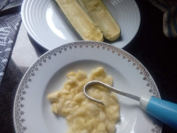 Lavamos el calabacín y lo partimos porla mitad. Hacemos unos cortes en la parte blanca para luego vaciarlos con facilidad. Metemos en el micro 10 minutos.