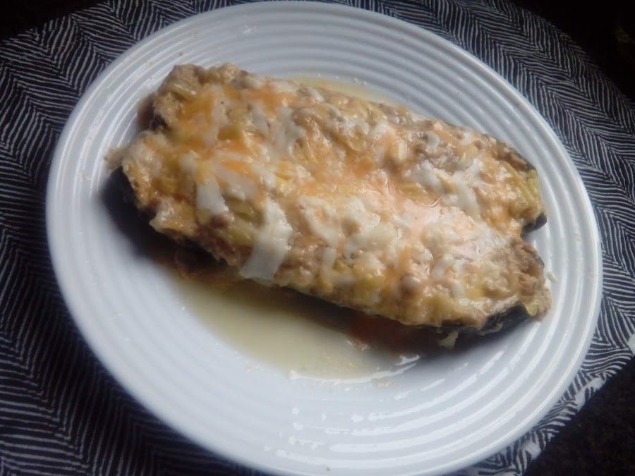 Rellenamos con la mezcla los medios calabacines y espolvoreamos con el queso. Metemos 3 minutos en el micro.
