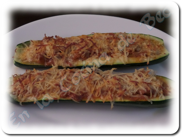 Sacamos y, con cuidado de no quemarnos, vaciamos el calabacín de su pulpa, para que nos queden 2 barquitos.