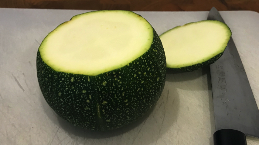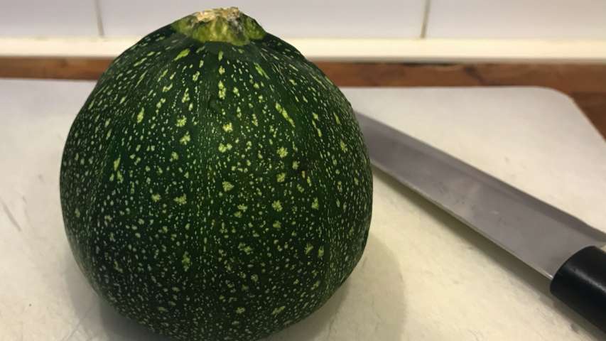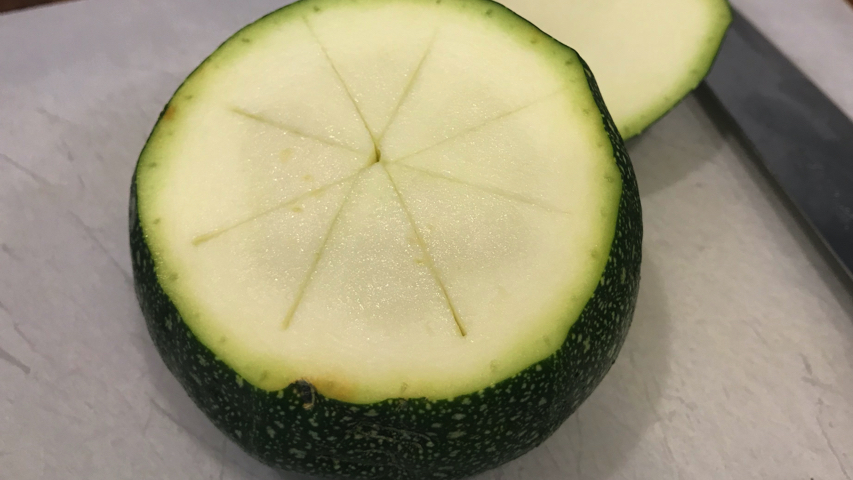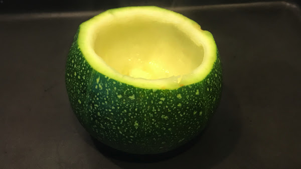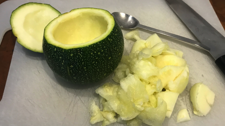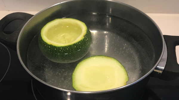 Corta el pedúnculo al calabacín. Hazle unos cortes al interior sin dañar las paredes y vacíalo de pulpa con una cucharilla.