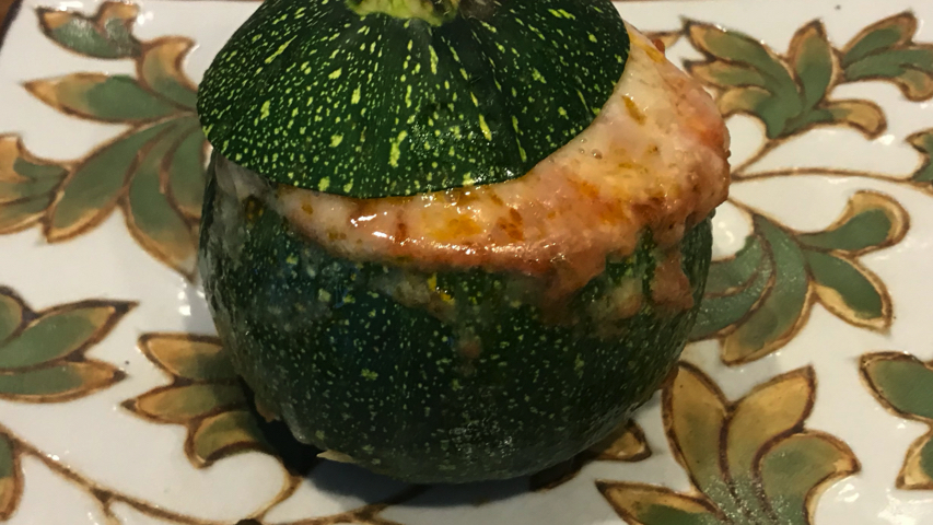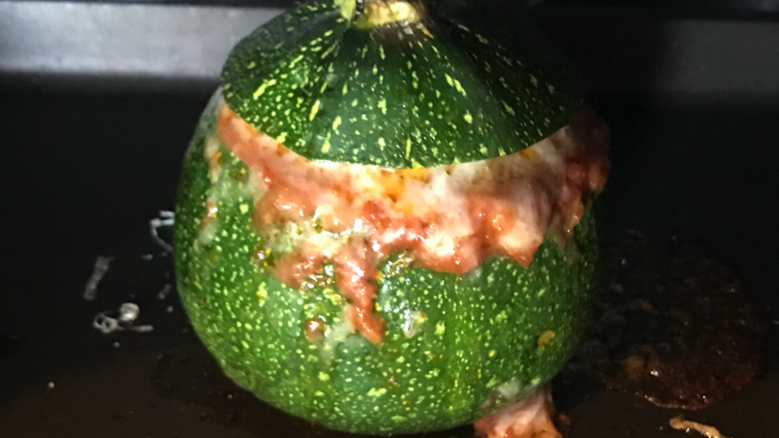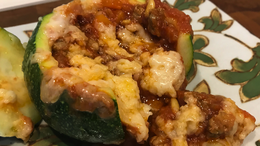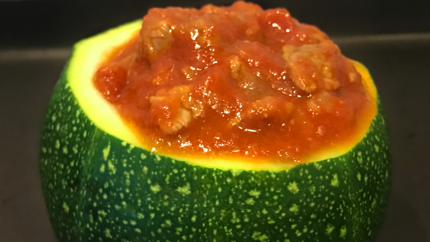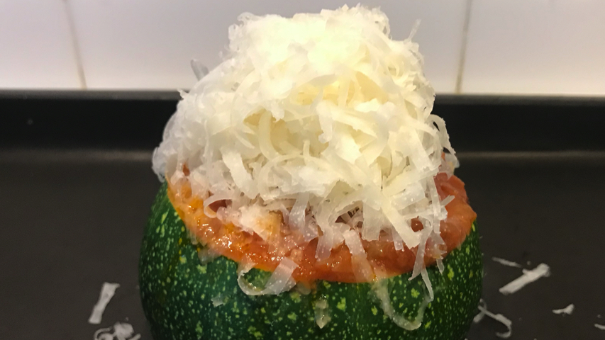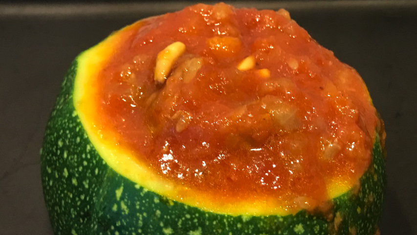 Rellena el calabacín con la boloñesa+calabacín+piñones.