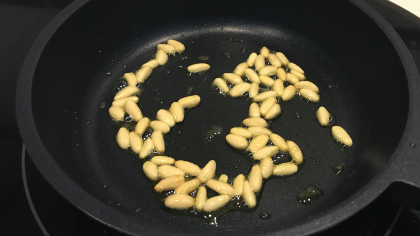 En una sartén a fuego alto y con unas gotas de aceite dora los piñones sin dejar de moverlos hasta que estén dorados. Una vez dorados incorpóralos a la sartén con el calabacín y la boloñesa.