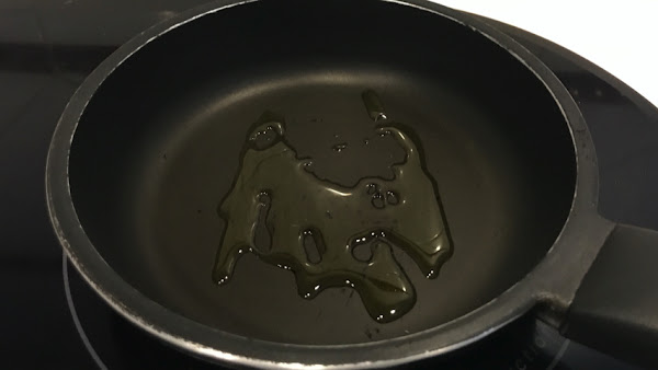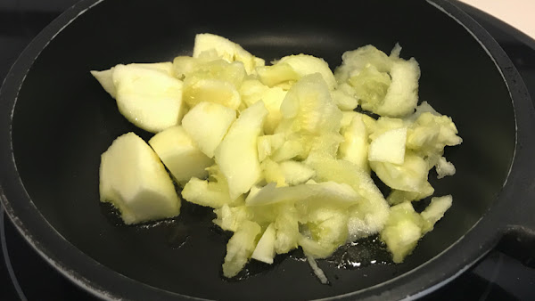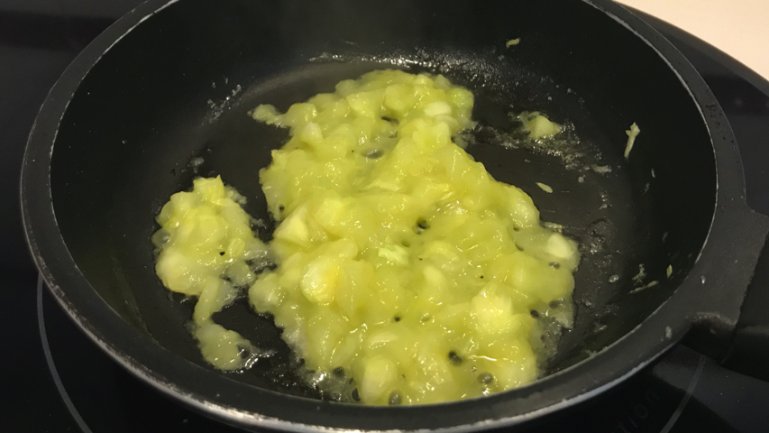 Prepara una sartén a fuego alto con unas gotas de aceite y sofríe los trozos de pulpa del interior del calabacín con un poco de sal.