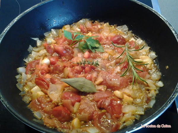 En la misma sartén, añadimos un poco más de aceite, pelamos y picamos la cebolla y los ajos y los sofreímos a fuego lento, durante 10 minutos. A continuación, añadimos el tomate pelado y picado, salpimentamos, añadimos las hiervas y freímos a fuego lento durante 25 minutos.