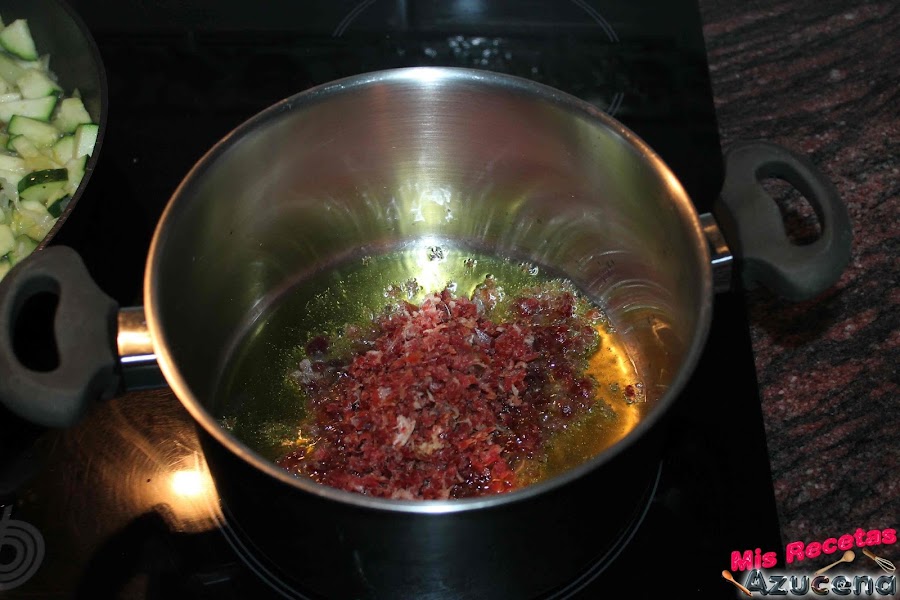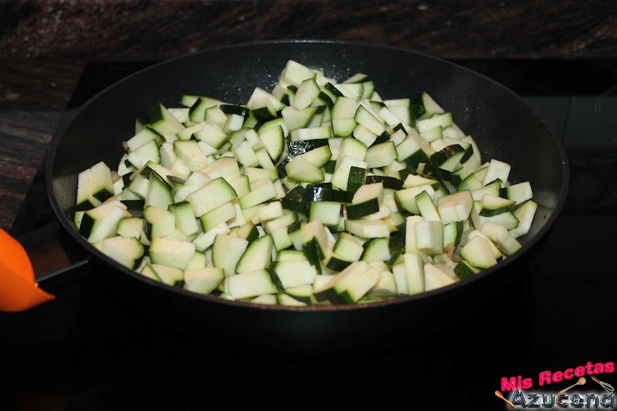 Transcurridos los 5 minutos toca añadir los calabacines troceados, removemos todo y estos los dejaremos sofreír entre 15 y 20 minutos, nos tienen que quedar tiernos pero no pasados, un poco antes de que los tengamos listos comprobaremos el punto de sal.