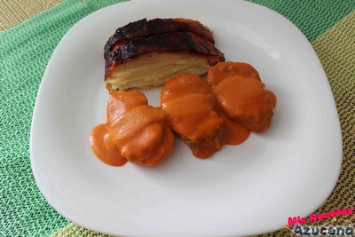 Cuando ya estén como queremos retiramos del fuego y los pondremos en la bandeja que los vamos a servir, esta tiene que ser apta para horno, en esta receta yo he utilizado una bandeja de 25 x 15 cm.