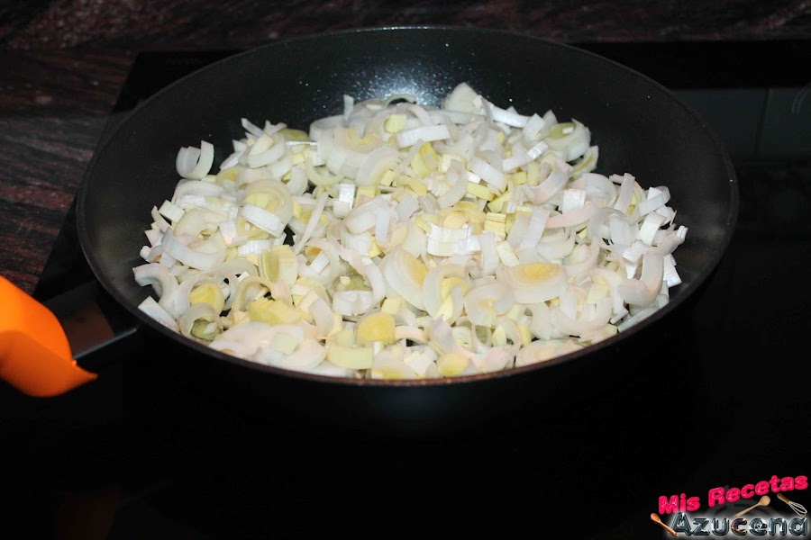 Ahora ponemos una sartén al fuego a fuego medio, cuando este caliente añadiremos un fondo de aceite y seguidamente añadiremos la cebolleta y el puerro, removemos, salpimentamos y dejamos sofreír durante 5 minutos.