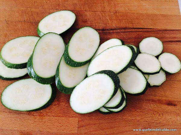Lavamos los calabacines y los cortamos a rodajas de aproximadamente medio centímetro.