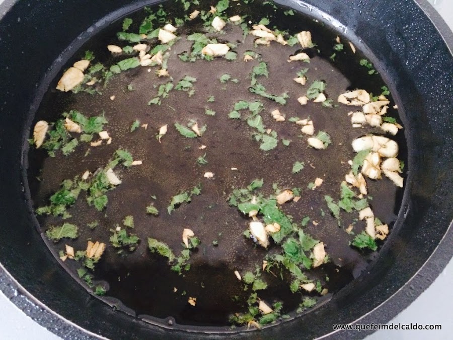 Doramos el diente de ajo y una vez dorado apagamos el fuego, incorporamos la menta picada.