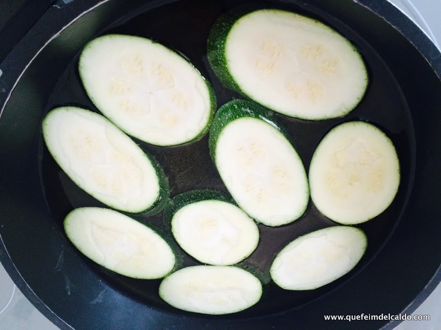 Ponemos en una sartén las 6 cucharadas de aceite de oliva y doramos los calabacines a tandas.