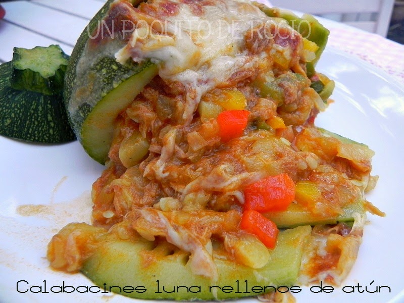 Mientras en una sartén grande calentamos un chorrito de aceite de oliva virgen, y rehogamos una cebolla cortada en cuadraditos, medio pimiento rojo de asar pequeño, medio amarillo y medio verde {también paquete de Lidl que venían los tres} cortados igual, los mezclamos unos cinco minutos y después ponemos todas las bolitas de la carne de los calabacines que previamente habremos troceado para dejarlas más pequeñas. Salpimentamos, agregamos un par de cucharadas de tomate frito natural y un poco de cúrcuma, menos de media cucharita pequeña y refreimos otros cinco minutos. Por último añadimos 3 latas de atún al natural bien escurrido. Mezclamos todo bien y rellenamos los cuatro calabacines. Los disponemos en una fuente de horno, y coronamos cada uno con un puñadito de mozarella rallada.