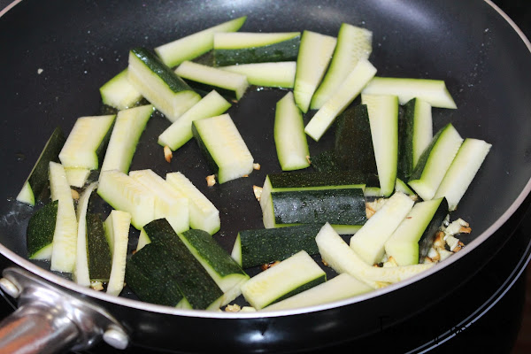 Cortamos el calabacin con piel en bastoncitos y lo sofreímos.