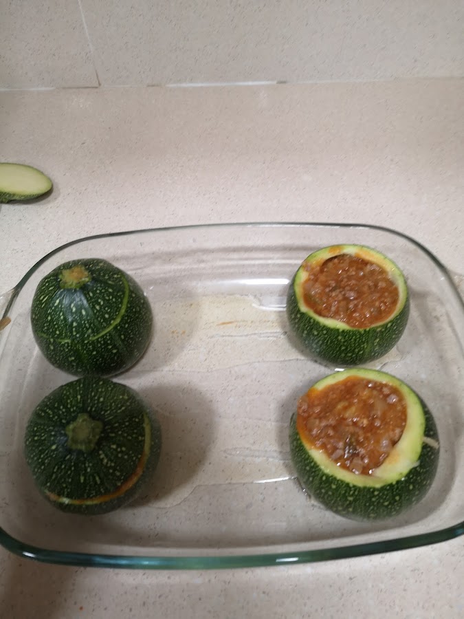 Precalentar horno a 180°C arriba y abajo y poner dentro los calabacines rellenos.