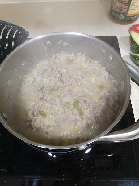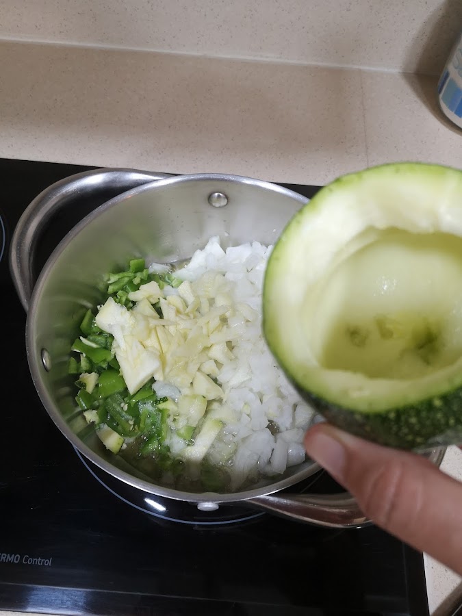 Poner a pochar, la cebolla, el pimiento y la pulpa de los calabacines, por eso antes los vacíe con una cucharilla