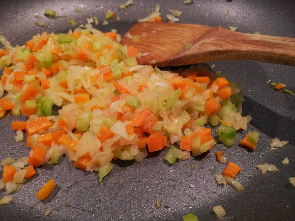 Por otro lado picamos la cebolla, la zanahoria, el apio y el puerro (siempre bien lavados antes) y los vamos pochando en una sartén con unas 2 cucharadas de aceite de oliva. Les echamos una pizca de sal para que las verduras suden y se hagan antes.