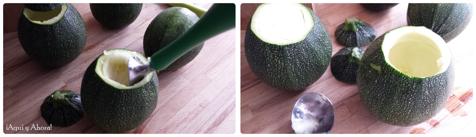 Elaboración:Lavamos bien los calabacines y con la ayuda de un cuchillo le cortamos la parte superior y reservamos esta parte para después colocárselo como un sombrero al calabacín. Con la ayuda de una cuchara para hacer bolas de helados quitamos toda la carne del calabacín con mucho cuidado. Picamos bien pequeño la cebolla, los pimientos y el relleno de los calabacines.
