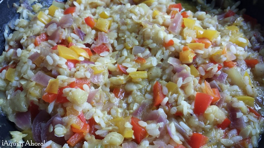 Ponemos al fuego una olla con abundante agua para cocer el arroz con una pizca de sal. El arroz tiene que quedar un poco durito ya que se terminará de cocerse en el horno y escurrimos. En una sartén con un chorrito de aceite de oliva sofreímos la cebolla, los pimientos y el relleno del calabacín. Añadimos el arroz bien escurrido, salpimentamos, mezclamos bien los ingredientes y lo dejamos unos minutitos más en el juego. Así quedaría el relleno para nuestros calabacines.