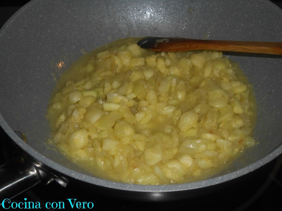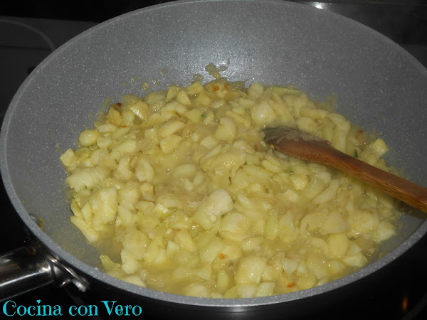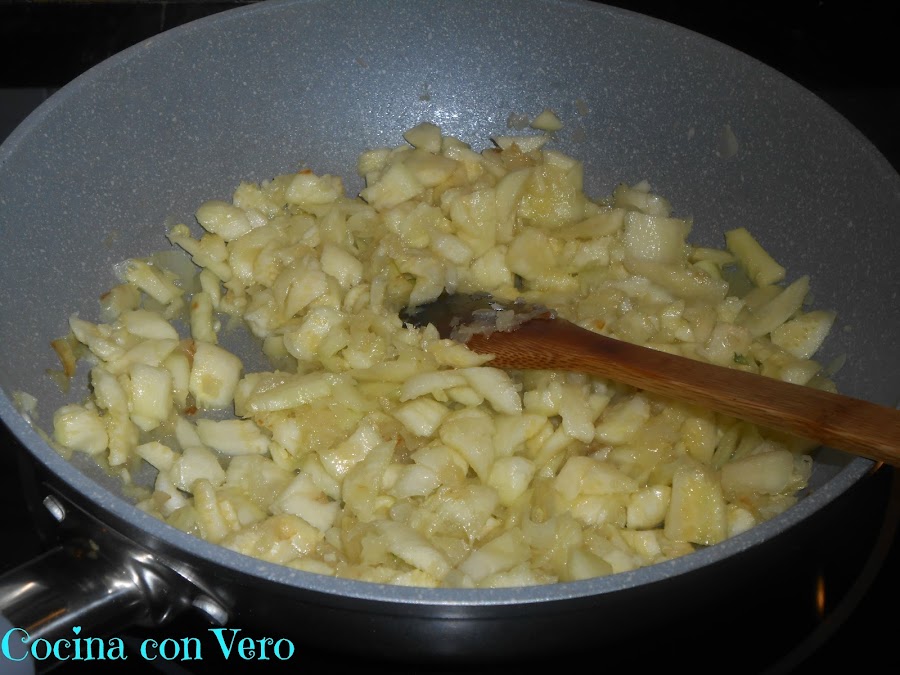 Una vez que esté dorado, añadimos la carne blanca del calabacin hasta que se haga, si vemos que está seco le añadimos un poco de aceite.