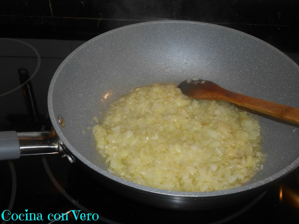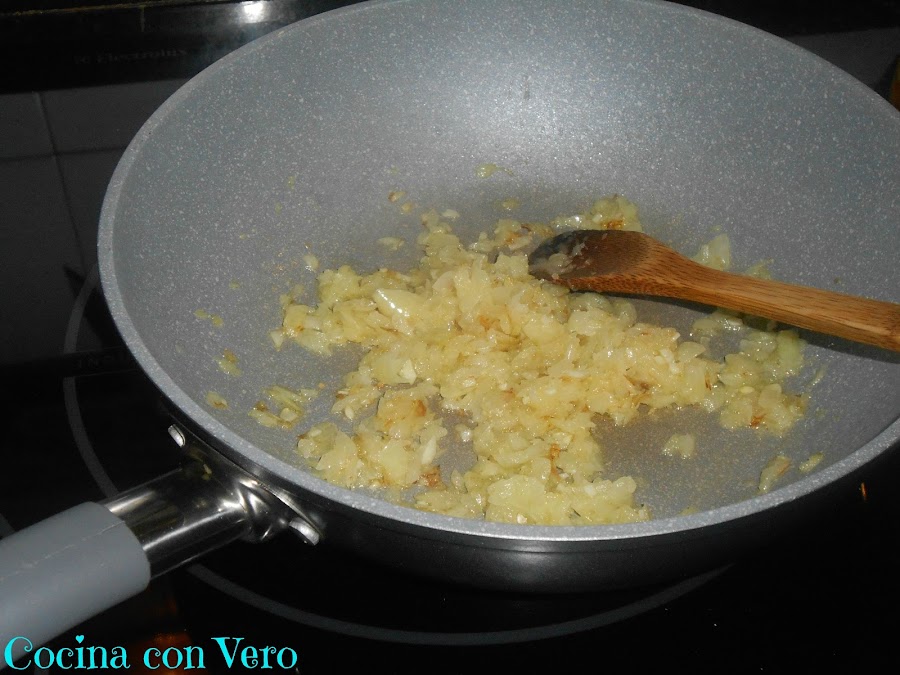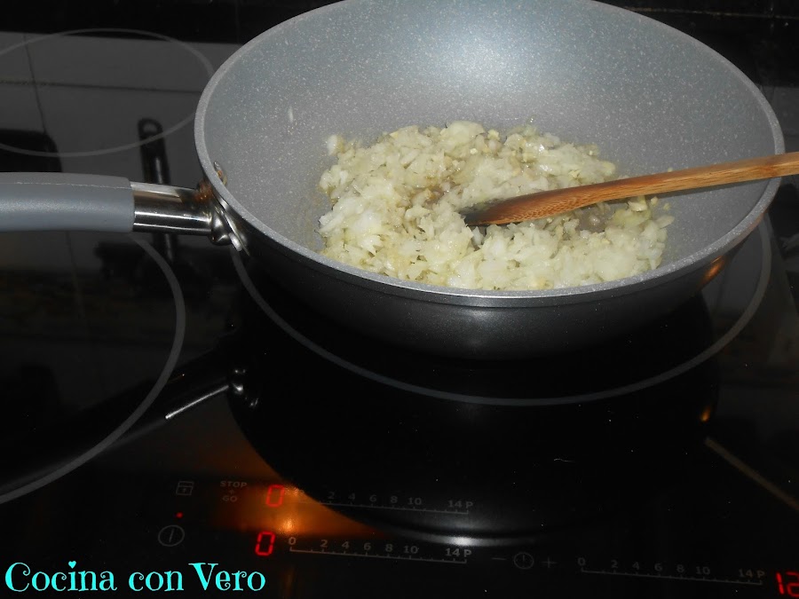1/ En una sartén o wok ponemos el aceite (las 2 cucharadas y 1/2), la cebolla ya picada y el ajo también picado previamente a sofreír con la sal, dando de vez en cuando unas vueltas con la ayuda de una cuchara de madera.