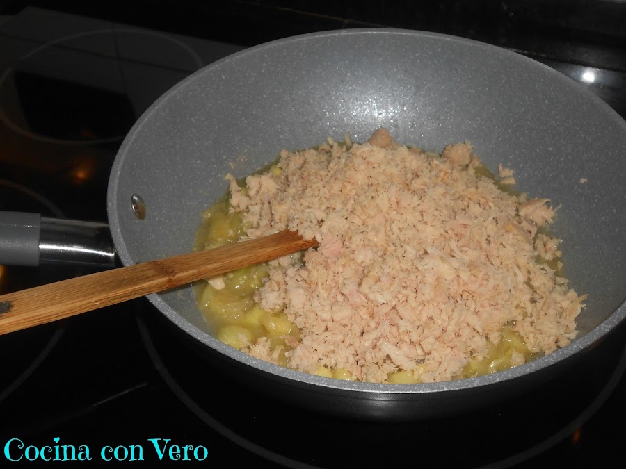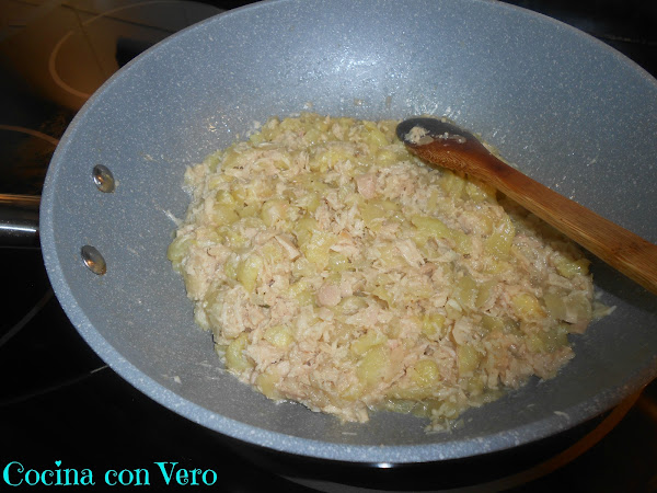 Lo dejamos enfriar y cuando esté incluimos la lata de bonito por persona desmenuzandola previamente, lo revolvemos sin ponerlo al fuego.