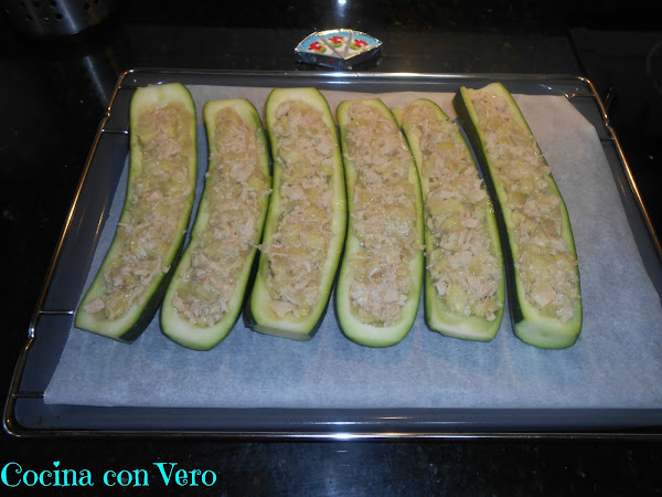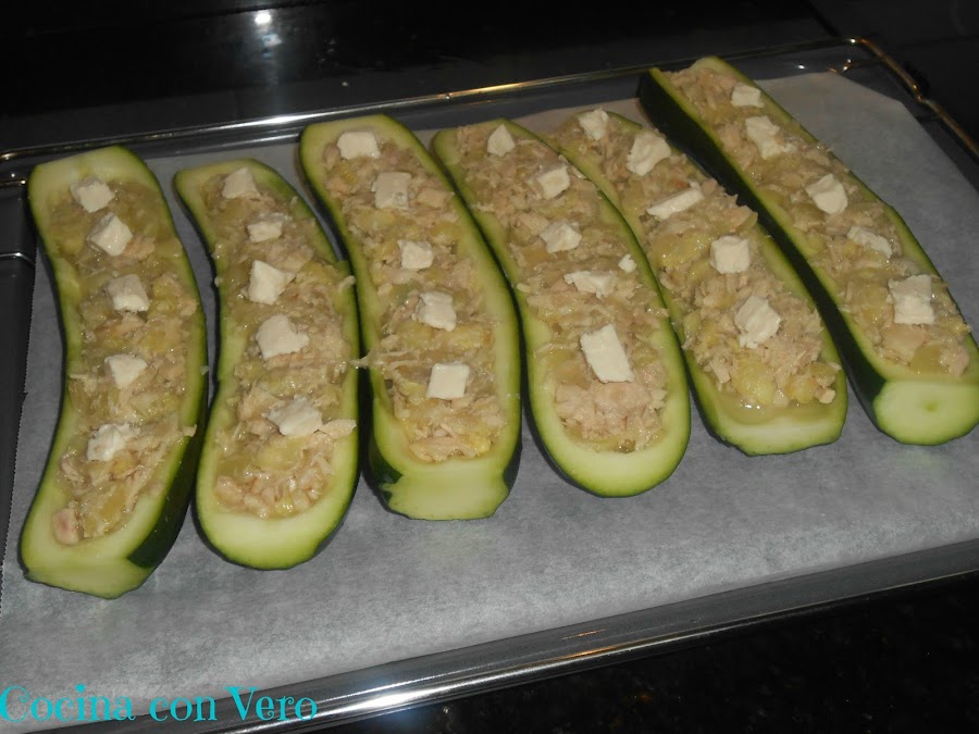 2/ En la bandeja de horno previamente forrada con papel vegetal ponemos los calabacines para rellenarlos con la mezcla que hicimos y le añadimos por encima los trocitos de quesito por encima de ello repartiéndolo, es un quesito por calabacin, es decir, para repartirlo entre las dos mitades de un calabacin por persona.
