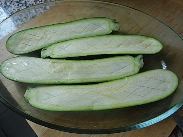 Lavamos los calabacines, los cortamos por la mitad a lo largo y con la punta de un cuchillo hacemos cortes en diagonal sin llegar hasta el fondo (foto de arriba)