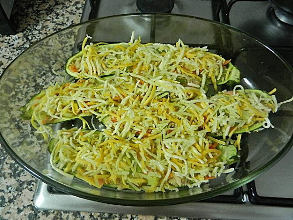 Rellenamos los calabacines con la mezcla de la cazuela y repartimos el queso rallado por encima.