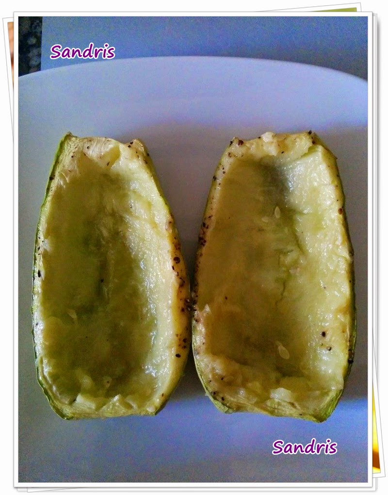 El calabacin lo hice al horno, lo partí por la mitad, le hice unos cortes, un poco de sal, aceite y pimienta negra y al horno a 200ºC hasta que esté bien hecho. Una vez templado, sacamos la carne del calabacin y reservamos. Tenemos que tener cuidado de no hacerle agujeros a la piel al vaciar porque sino el relleno que le pongamos se va a salir por ahí.