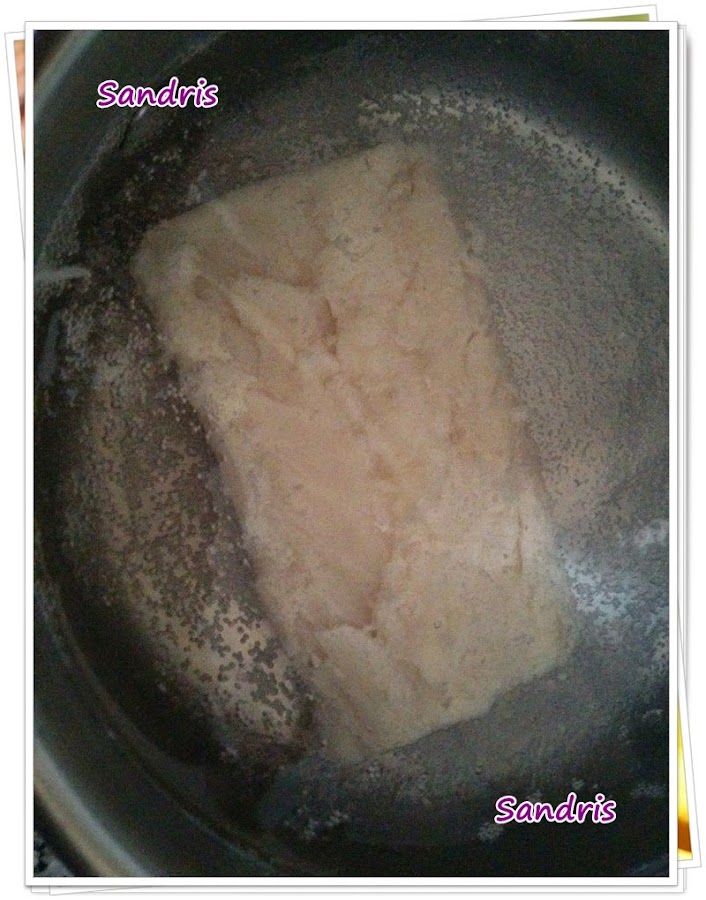 El bacalao lo tenía que desalar, lo tuve que desalar al menos 3 veces para que soltase toda la sal que tenía (la otra vez no lo desalé bastante y estaba la receta algo saladilla jejejeje). Para desalar, se pone el bacalao en un cazo con agua fria y cuando hierva, desechamos el agua y volvemos a empezar, y así así las veces que haga falta.