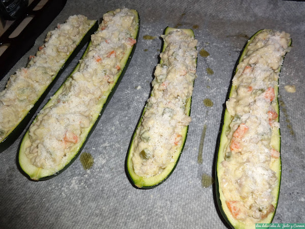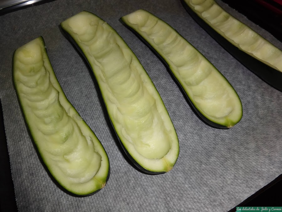 Lavamos los calabacines y los partimos de forma longitudinal, formando 4 "cuencos". Sacamos la carne de los calabacines con un cuchillo o un sacabolas, teniendo cuidado de no romper la piel.