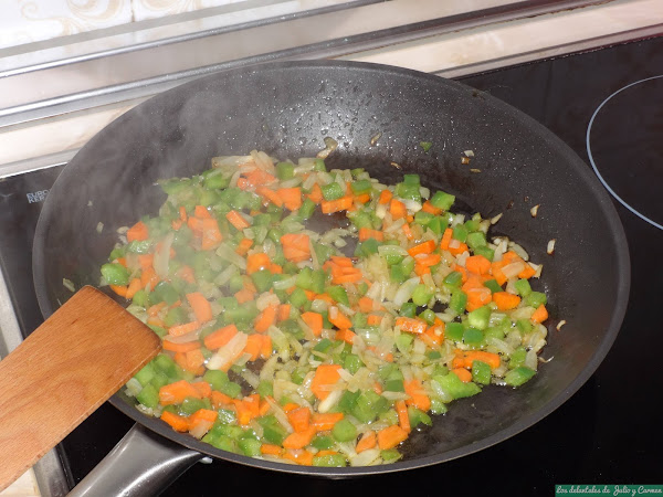 En una sartén con aceite, a fuego medio, pochamos la cebolla. cuando veamos que está dorada, vertemos el pimiento y la zanahoria, removiendo para que se vaya cocinando poco a poco. Salamos ligeramente.