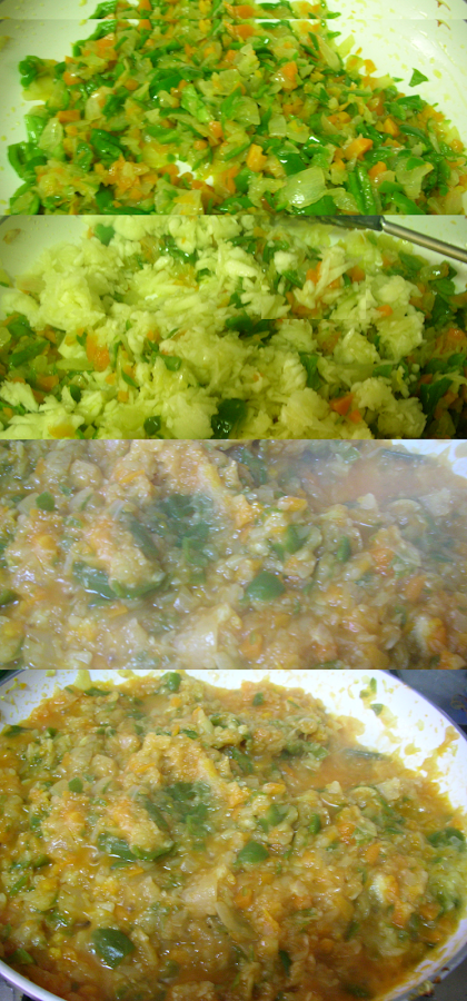 2-Para la farsa o relleno, ponemos en una sartén el aceite a calentar, cortar la cebolla, el pimiento y la zanahoria, a cuadros pequeños, y añadimos el diente de ajo, empezamos a sofreír todo junto despacio para que sude y no se quemen las verduras unos 10 minutos, salamos, y acontinuación ponemos la carne hasta que se haga, reservamos hasta que entibie.