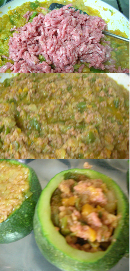 1-Labamos bien los calabacines, cortamos una tercera parte de la tapa y con una cuchara o un saca bolas los vaciamos bien, dejando medio centímetro de pared, para que no se rompan después de hervidos, los ponemos en una olla con agua a hervir, los calabacines y las tapas, a fuego medio de 15 a 20 minutos, teniendo en cuenta que no se hagan mucho, lo suficiente para que se queden bien enteros. Los sacamos y ponemos boca abajo en un plato con papel absorbente para que escurran bien el agua, y reservamos.