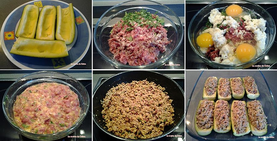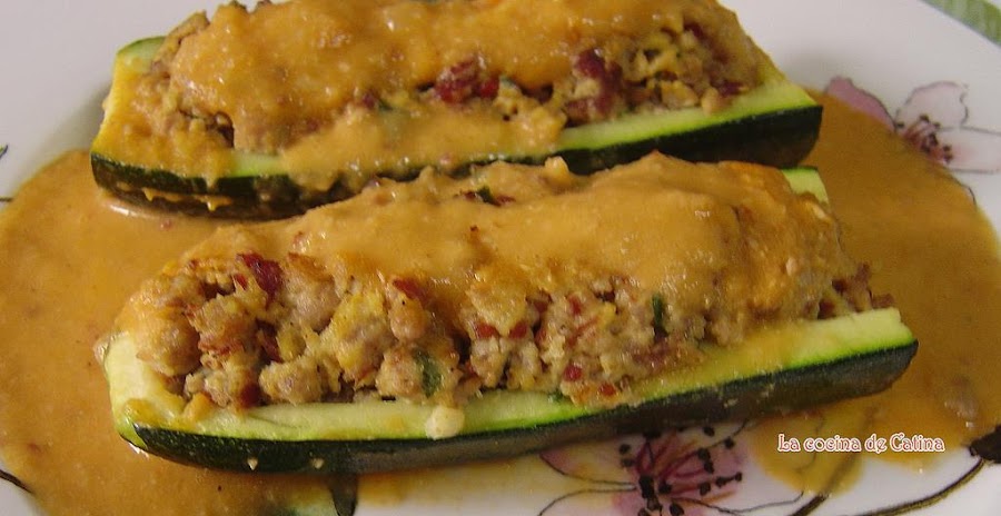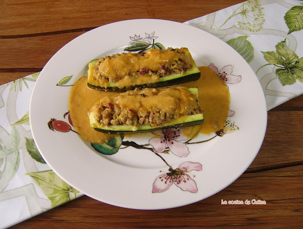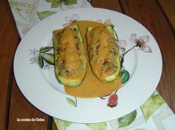 Cortar los calabacines por la mitad y cada mitad en dos en sentido longitudinal. Con una cucharilla sacar la pulpa del calabacín sin llegar a romperlos de forma que queden como unas barquitas. Las colocamos en un plato de cuatro en cuatro, las tapamos con una tapadera para microondas y le damos 4 minutos a máxima potencia en el microondas y reservamos.