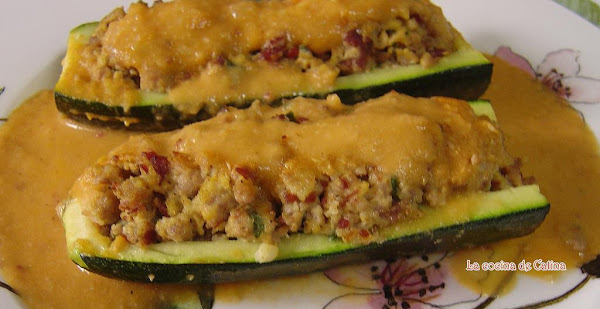 Ponemos una sartén con aceite y sofreímos esta mezcla. Rellenamos las barquitas de calabacín con la mezcla y las vamos colocando en una fuente apta para horno.