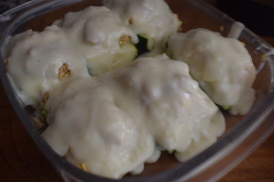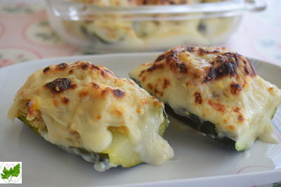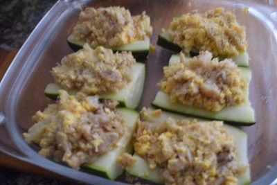 En un bol mezcla la coliflor con las yemas de huevo duro. Rellena las mitades de calabacín.