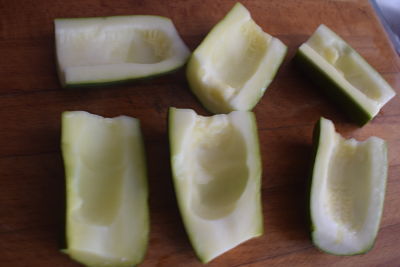 Lava el vaso, echa 1 litro de agua y coloca el recipiente varoma en su posición. Corta el calabacín longitudinalmente y después haz tres trozos. Saca la pulpa ( sólo las semillitas ). Programa 20 minutos, temperatura varoma, velocidad 1.