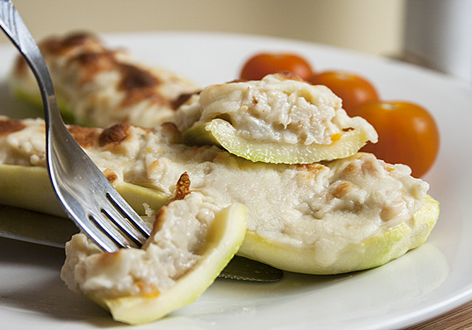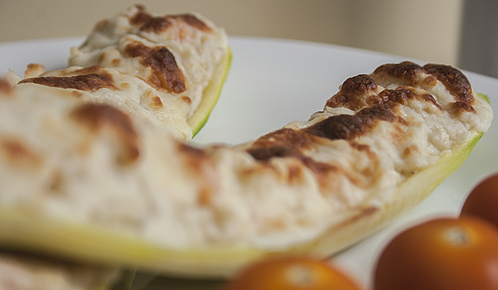 Mezclamos las verduras salteadas con la bechamel y rellenamos los calabacines con esta mezcla.