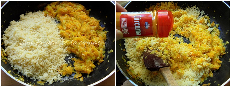 6. Una vez tengamos la verdura totalmente pochada, pero todavía con el fuego encendido, mezclamos con el cuscús y agregamos la cúrcuma. Rehogamos unos minutos (si hace falta añadimos un poquito más de aceite para que no se pegue) y ya lo tenemos listo para consumir tal cual o para rellenar las barquitas de calabacín.