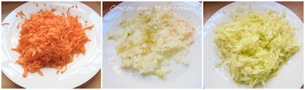2. Rallamos la zanahoria, la cebolleta y el centro de los calabacines con la parte de agujeros grandes del rallador.