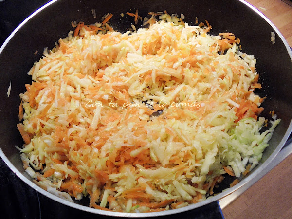 3. Sofreímos la verdura rallada, sazonada con un poco de sal, en unas cucharadas de aceite de oliva a fuego medio hasta que esté bien pochada (aproximadamente 15 minutos), removiendo muy a menudo. Comprobarás que está bien hecha cuando la zanahoria esté tierna.