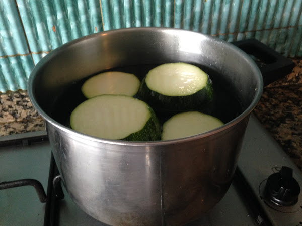 Metemos los calabacines con su tapa ya cortada en una olla con abundante agua y una pizca de sal y dejamos hervir entre 5 y 7 minutos. Hay que ir con cuidado con el tiempo de cocción pues si nos pasamos no quedarán firmes y serán más difícil de rellenar, además hay que tener en cuenta que van a pasar por el horno después.