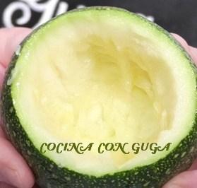 2. Se cortan los calabacines por arriba como hicieramos una tapadera, se reserva y al resto del calabacín se retira la pulpa, con cuidado de no repelar mucho los filos para no quebrar la hortaliza. Cómo vamos a preparar 4 calabacines, se sigue el mismo proceso con los restantes.