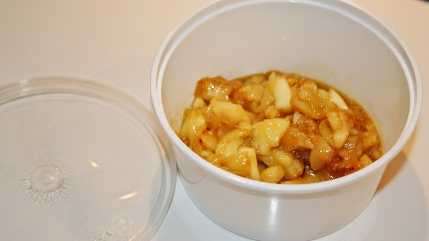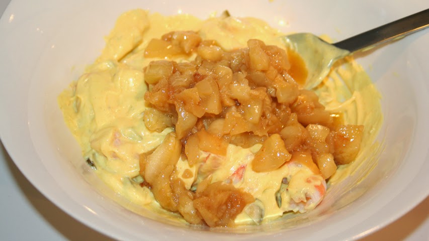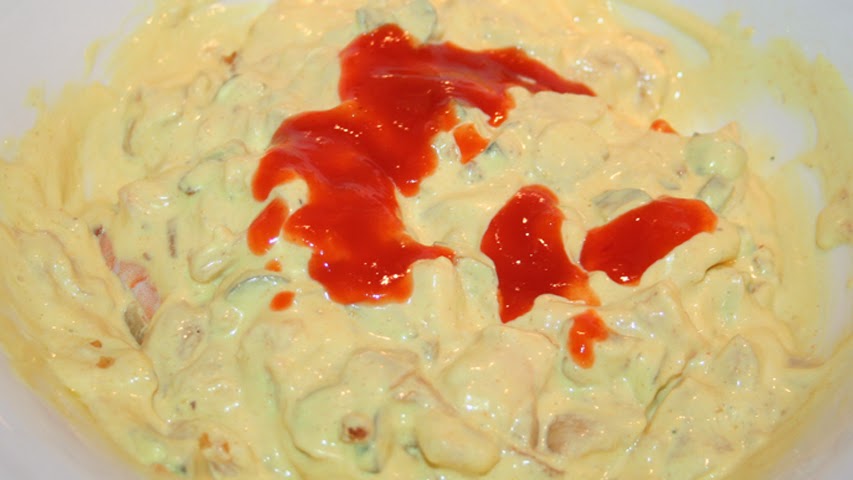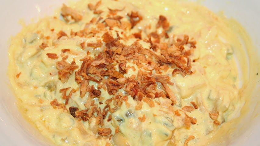 Al final me decidí por una ensaladilla con langostinos cocidos y una especie de mahonesa que preparé con cúrcuma y ajo en polvo para darle carácter y a la que añadí unos pepinillos en vinagre que yo mismo preparo (aquí podéis ver cómo) y la pulpa de los propios calabacines salteada en un poco de aceite de oliva. Después de probar este relleno, decidí darle un punto de crujiente añadiéndole esta cebolla frita y como deshidratada que venden desde no hace mucho en todos los supermercados para añadir a las hamburguesas y a los perritos calientes. Por último picante, un buen chorrete de salsa de chiles.