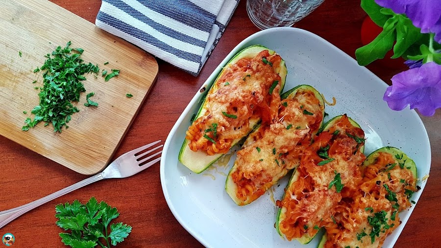 3.- Ponemos a cocer la pasta en agua hirviendo con sal y una hoja de laurel, durante 12 minutos o siguiendo las instrucciones del fabricante. Una vez estén aldentes las escurrimos bien. Mezclamos los macarrones con la salsa de tomate y atún. Con una cuchara vaciamos los calabacinos sin romperlos, rellenamos cada calabacino con los macarrones en salsa de atún. Cubrimos las verduras con queso de gratinar, gratinamos los calabacinos rellenos de macarrones 10 minutos en el horno hasta que el queso esté bien derretido (con el horno precalentado a 180º). Servimos con un poco de perejil fresco picado por encima.